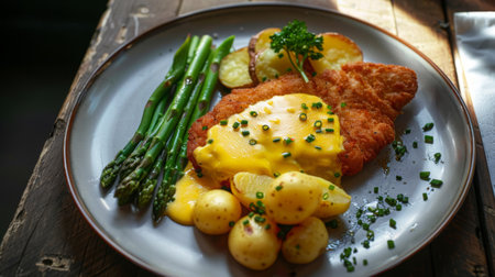 Traditional schnitzel dish with a side of asparagus. Appetizing schnitzel in golden breading, alongside crunchy asparagus and potatoes, delicately seasoned with herbs and spices.