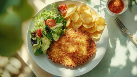 A delicious crispy chicken cutlet served with fresh salad, golden chips, and a side of sauce. A perfect meal for lunch or dinner, vibrant and appetizing.