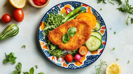 A beautifully presented plate of crispy breaded fish served with a variety of fresh vegetables, creating a colorful and appetizing meal. Perfect for healthy dining.