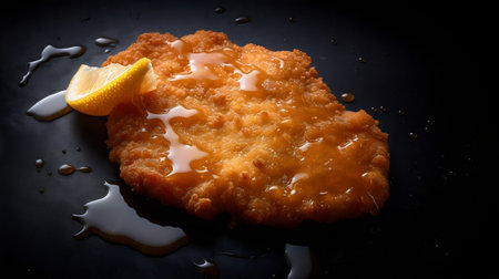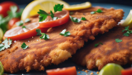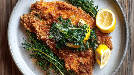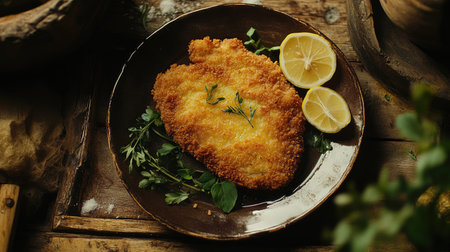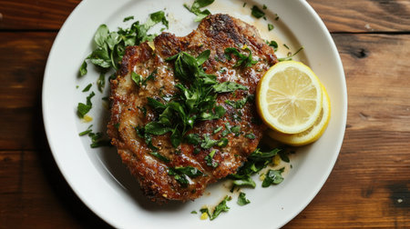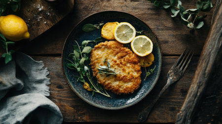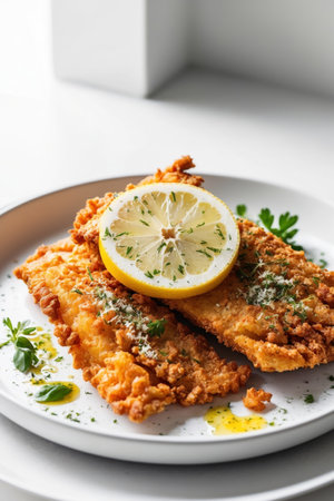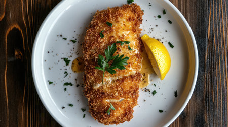 A delicious crispy breaded cutlet garnished with a vibrant lemon slice and fresh herbs, beautifully plated for an enticing culinary experience.