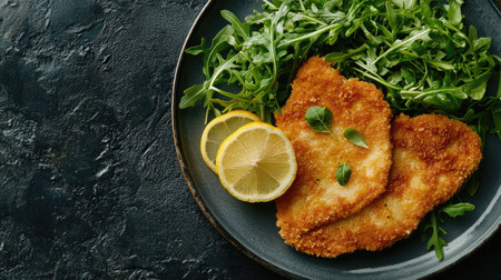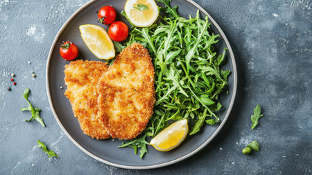 A beautifully styled Milanese cotoletta served with fresh greens and slices of lemon. This delicious dish showcases crispy textures and vibrant colors, perfect for any meal.