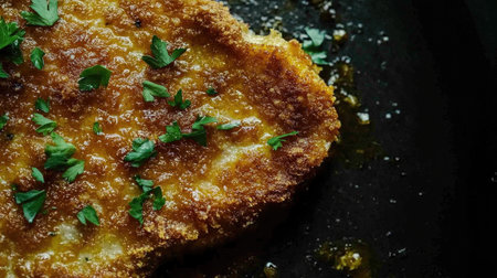 A close-up image of a crispy Cotoletta alla Milanese, showcasing its golden crust and garnished with fresh herbs, representing Italian culinary traditions and flavors.