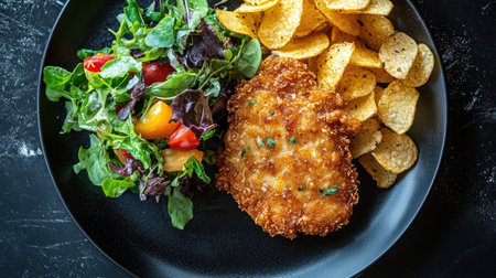 A delicious savory fried meat cutlet served alongside a fresh salad and crispy chips on a stylish black plate, perfect for any meal setting.
