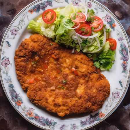 German schnitzel with lemons and limes tomatoes and lambs lettuce salad : Generative AI