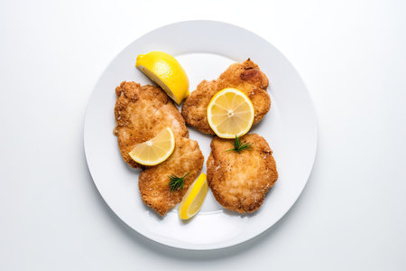 Traditional fresh fried vienna schnitzel served on a white plate with lemon and parsley on white table background. Overhead view