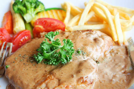 pork chop steak and gravy on white dish