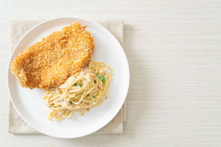 homemade spaghetti pasta white cream sauce with fried fish