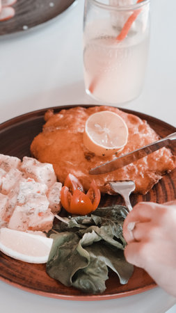 battered fish steak with colorful salad and vegetable