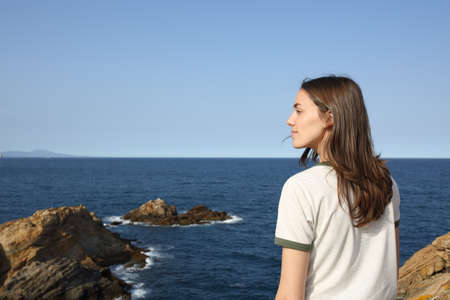 Casual woman standing alone contemplating views on the beach