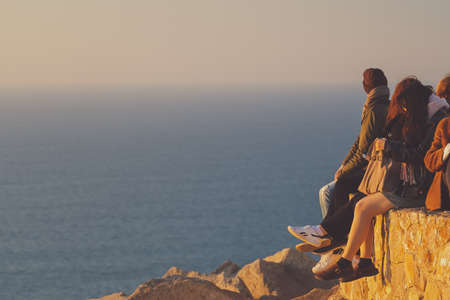 Anonymous people standing at the edge of europe at sunset, Cape roca. Westernmost extent of continental Europe and the Eurasian land mass.