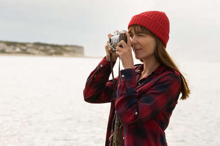 Beautiful woman taking photos with a vintage camera while standing on a cliff