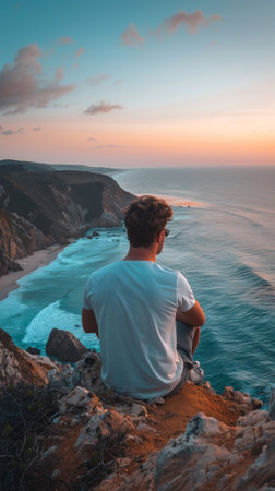A man sitting on a cliff overlooking the ocean and sky, AI