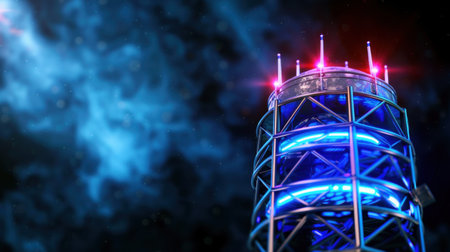 A striking image of a futuristic water tower accented with vibrant neon lights, set against a backdrop of cosmic clouds and a dark night sky, showcasing modern urban design.