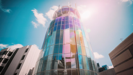 A striking modern high-rise building under a bright blue sky, showcasing contemporary architecture and urban living elements. Ideal for design and real estate projects.