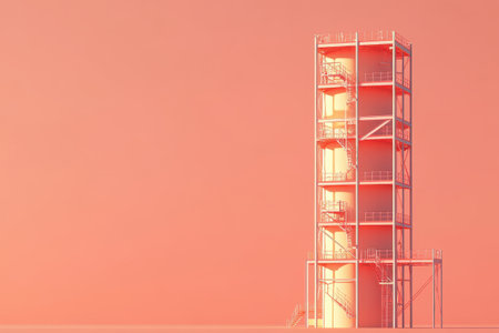 Industrial metal structure with staircases, pipes, and railings against a clear sky. The construction features steel beams, rivets, and rusted details, emphasizing an urban, futuristic aesthetic