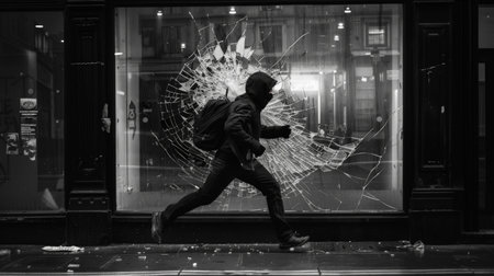 A figure wearing dark clothing and a mask sprinting away from a broken shop window