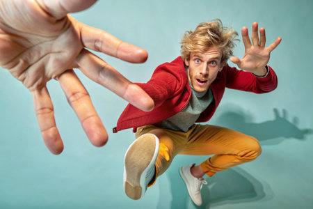 Young man jumping and gesturing with his hands. Studio shot.