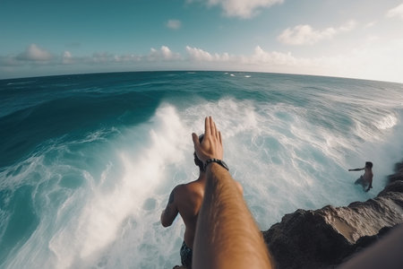 Diving into Serenity: A Man in Blue Shorts Embarks on an Aerial Adventure