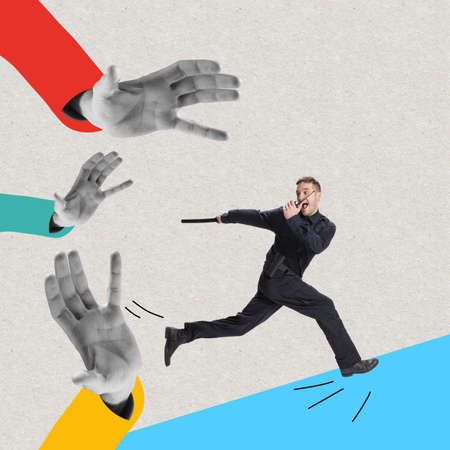 Art collage with young man, policeman officer wearing black uniform running away from human hands isolated on light background. Concept of job, caree, law and order.