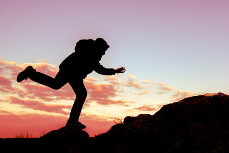 Silhouette of athlete, jumping over rocks in mountain area against sunset. Training running and jumping in difficult conditions in a beautiful nature with cloudy sky