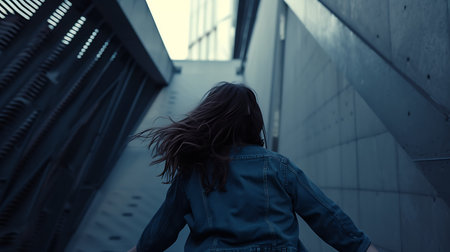A woman walks briskly through a city street during dusk, her yellow jacket and scarf catching the wind. The background is blurred, highlighting her swift movement and focused expression.