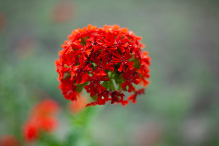 Red flowers Lychnis chalcedonica closeup on a blurred background of green leaves on a Sunny day in the summer garden.