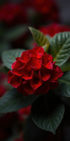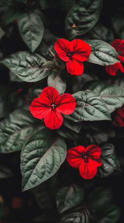 Close-up capturing the vibrant red petals of several flowers contrasted against the deep green hues of textured foliage, showcasing a captivating botanical composition.