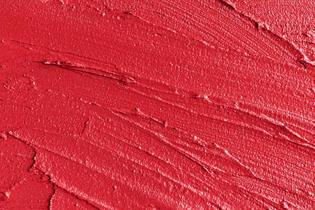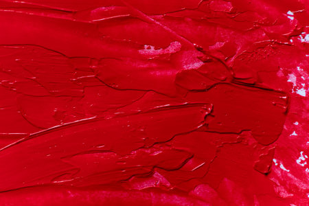 Creamy red lipstick in liquid form, textural strokes, macro background. Concept of trends in cosmetics, makeup.