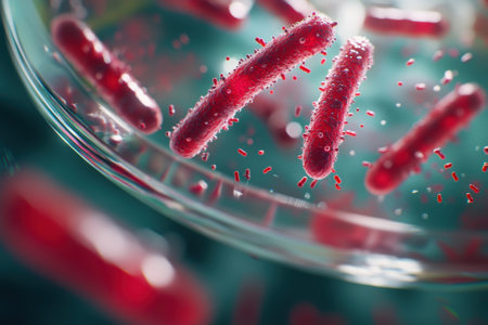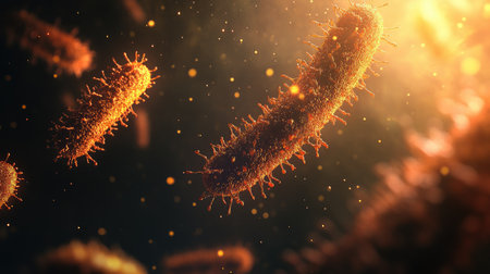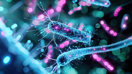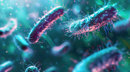A detailed and vibrant depiction of bacteria viewed under a microscope, showcasing glowing details and abstract backgrounds, perfect for scientific and educational use.