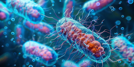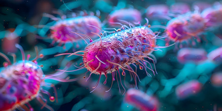 Microscopic view of bacteria with hair-like structures in a dynamic environment