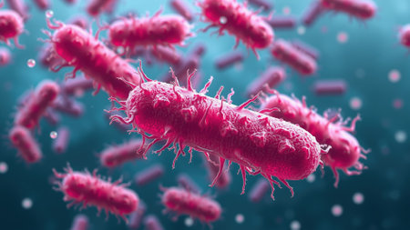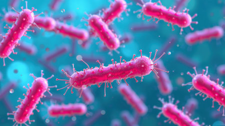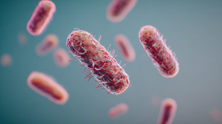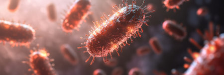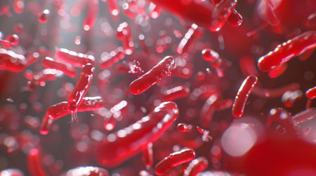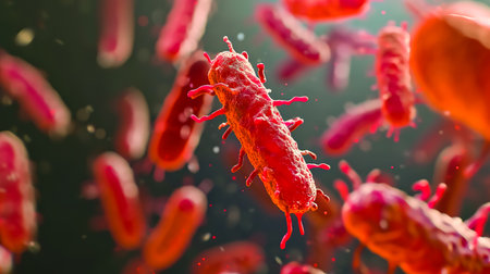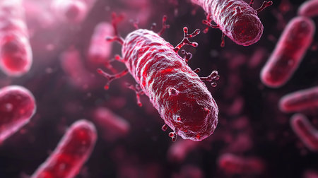 Detailed 3D render of red bacteria cells with fimbriae, floating in a dark fluid. Focus on microscopic details, showcasing cellular structures and textures.