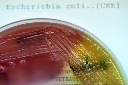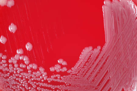 Escherichia coli colonies as test on MacConkey agar plate. Focus on all agar surface in experimental laboratory Hospital.
