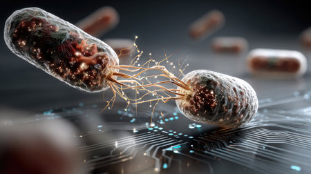This image showcases an imaginative depiction of bacteria interacting with circuit technology, highlighting the fusion of biology and innovation. The vibrant details emphasize cellular processes in a digital landscape.