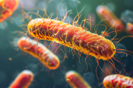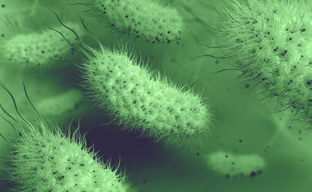 Escherichia coli bacteria, 3D illustration. E. coli is a Gram-negative rod-shaped motile bacterium covered with flagella
