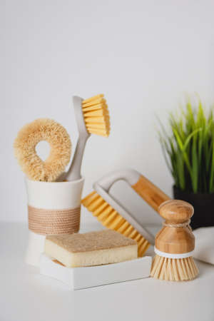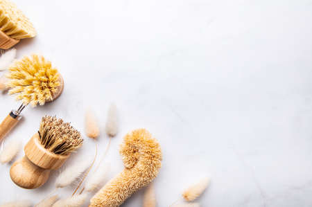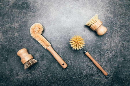 Eco-friendly set of natural cleaning brush products on kitchen table.