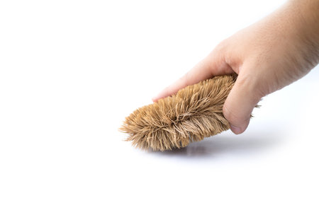 human hand holding a cleaning brush isolated on white