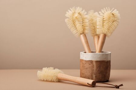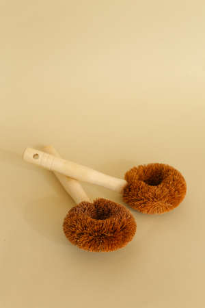 Two classic wooden dish brushes in light background with copy space. Concept of reducing of plactic dishbrushes and ecological products in online shop.