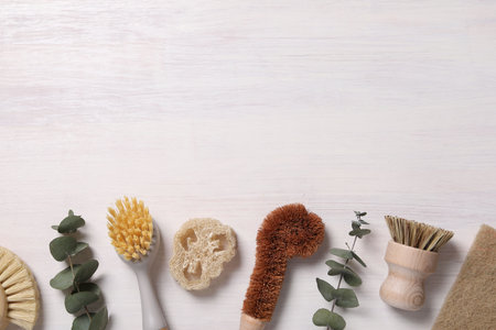 Cleaning brushes, loofah and eucalyptus leaves on light wooden table, flat lay. Space for text