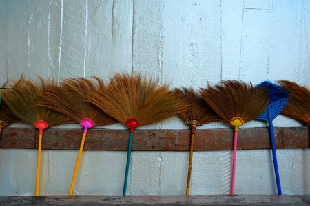 Broom hung on the white wall, closeup of photo