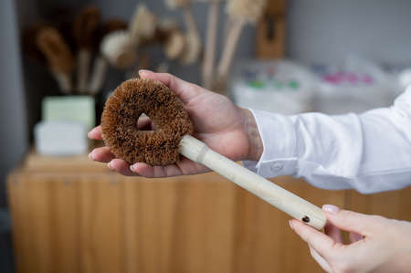 Woman holding eco sponge for washing dishes. Natural products with zero waste