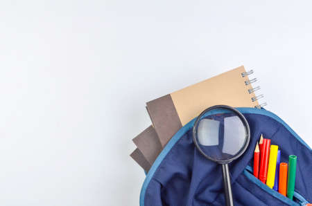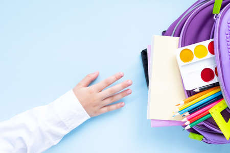 Backpack with school supplies. Back to school concept. View from above. Copy space