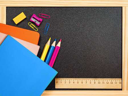 multicolored school supplies lie on black chalkboard, short focus, partial blur