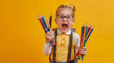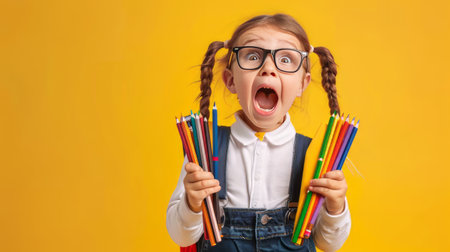 School child in glasses in school uniform holds colored pencils. Banner. emotional surprise face