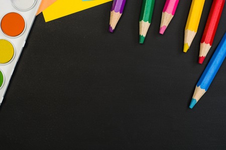 mix of colorful wooden pencils on black chalkboard with copy space, education, drawing concept