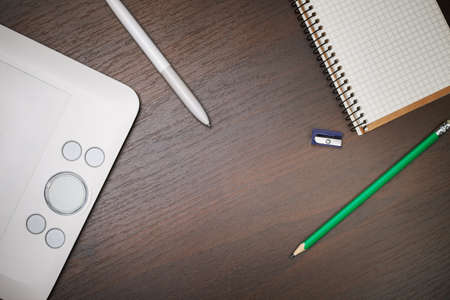 Flat lay of office equipment for working with laptop, graphic tablet, paper, pencils, glasses. Small illustration home business. View from top above. Freelance workplace concept. Toned with filters.