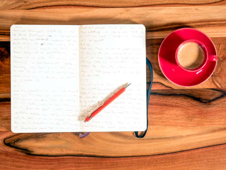 Camera, coffee, diary and pens on a wooden table in the coffee shop in front of the window