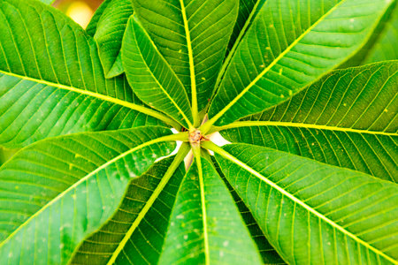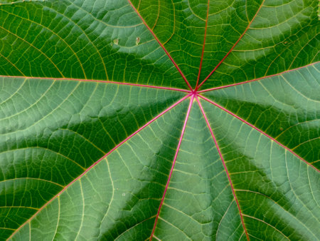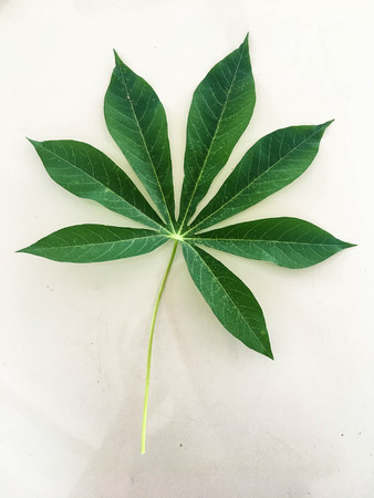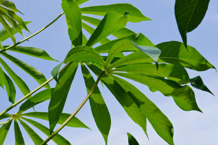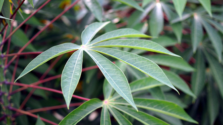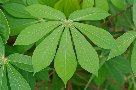 cassava leaves with sharp green veins pattern showing natural tropical foliage and healthy agriculture crop