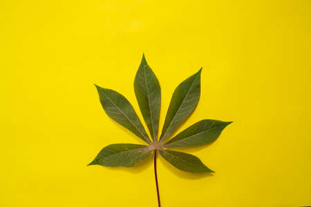 Summer Tropical Composition. Cassava Leaves On A Yellow Paper Background. Summer Concept. Cassava Leaves Isolated On A Yellow Background