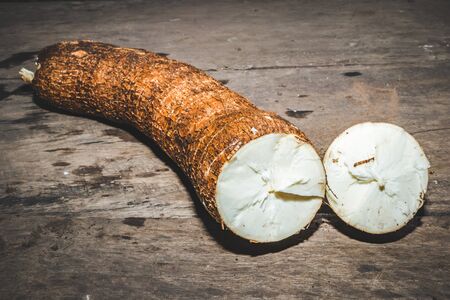pile of cassava fruit and cassava flour on a background of rustic and dark texture (Manihot esculenta)