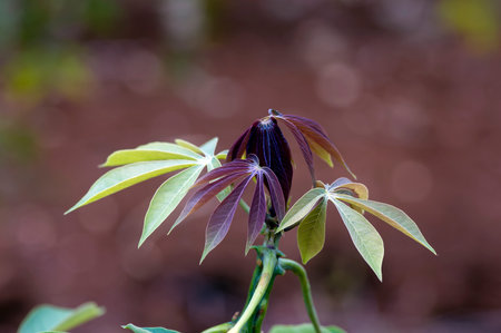 Cassava, Mandioa, Manioc, Tapioca trees (Manihot esculenta), young leaves, shallow focus.